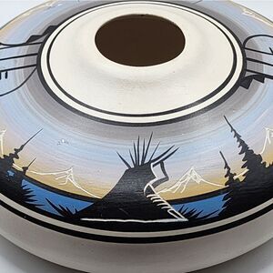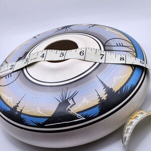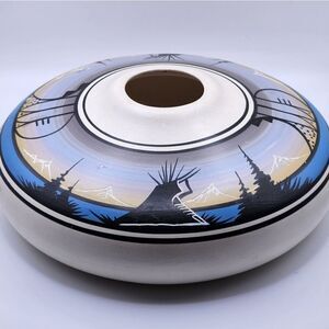 This handmade Native American seed pot/vase/planter is a unique piece of art crafted from clay by a Navajo artisan. The item features handpainting and decorative elements, making it a beautiful addition to any collection. The pot/vase/planter is signed by the artist, adding to its authenticity and value.