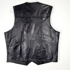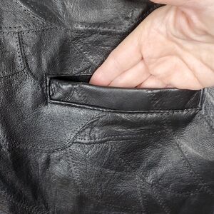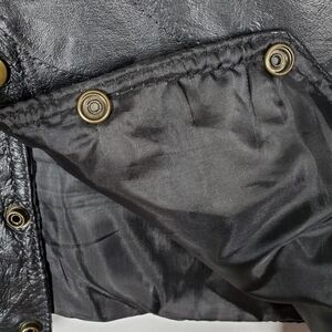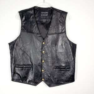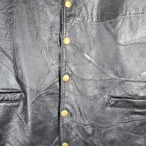 Unisex, leather, front pockets, gold snap closure, lined, pattern to leather, vest.