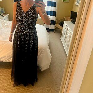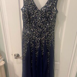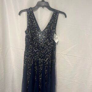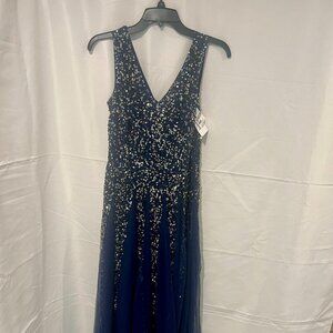 FEATURES/ACCENTS: Dark, Navy Blue fitted bodice with zipper in back. V neck style. Sleevless with intricate embroidered rhinestone pattern on top of dress going mid way down. Fit and flare style is forgiving for most body styles. Very comfortable. Fully lined.