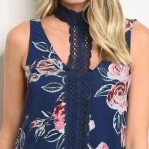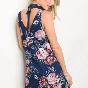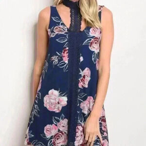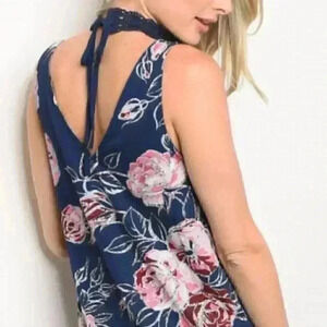 NAVY BLUE Sleeveless dress with crochet choker detail running down center of dress, ties at neck and has multi colored floral print.