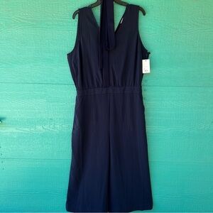 NAVY BLUE SURPLICE BACK JUMPSUIT WIDE LEG + POCKETS TIE BELT SIZE XL NWT