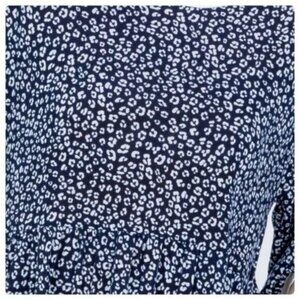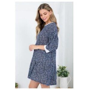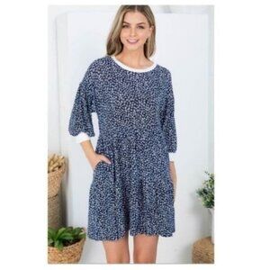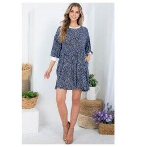 NAVY DITZY FLORAL DRESS. RIBBED COLLAR AND SLEEVE CUFFS. BUTTERY SOFT. TIERED DRESS. VERY PRETTY!! SIDE POCKETS.