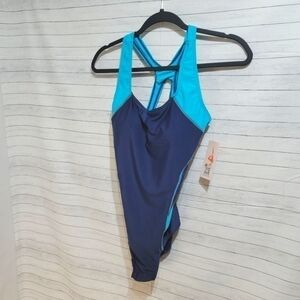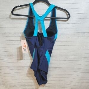 BRAND NEW W TAGS CHARMO COLOR BLOCK RACER BACK ONE PIECE NAVY & LIGHT BLUE/AQUA COLOR