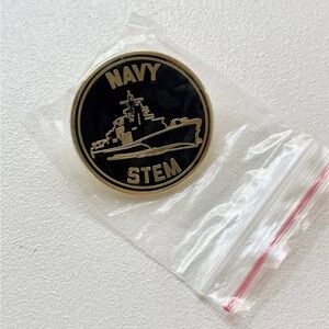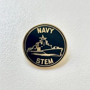 U.S. Navy STEM PIN- Naval Science, Technology, Engineering & Mathematics (STEM) round enamel pin with a navy ship design. Features 'Navy STEM' text. Perfect for collectors.