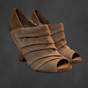 NWOT - Peep toe "shoeties" by NAYA. Bamboo/Camel color (3rd pic shows color most accurately). Cushioned insole and breathable design provide style and comfort. Ruched Kid suede with leather and a beautiful 4" wood wedge heel.