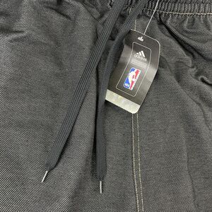 Logos/Branding: Embroidered Adidas logo at right thigh; NBA Authentics waistband label; round monogram patch at left thigh