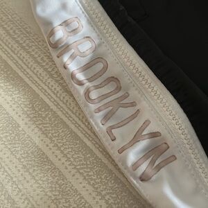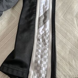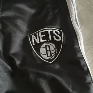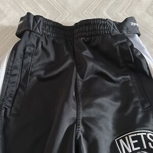 NBA Boys NJ Nets Zipway Black & White Pants. Elastic waistband. And Velcro closure. One side of the zipper gets stuck. Made of polyester. Size M. 27” inseam.