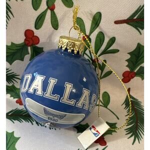 The product is a vintage 1980 glass Christmas ball ornament featuring the Dallas Mavericks, an NBA team. Officially licensed by the National Basketball Association, this unisex adult ornament comes in its original box and is a perfect addition for any basketball fan's collection. The blue-colored ball is a unique and nostalgic piece for fans of the Dallas Mavericks and basketball in general. Made in China, this one-size ornament is a classic and stylish way to show off team pride during the holiday season.