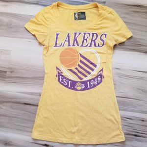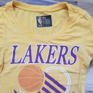 NBA LAKERS womens size X-SMALL t-shirt. Lightly used only worn a couple times and is still in beautiful flawless condition. No stains, no rips, no fading. Just a very cute t-shirt with a small pocket on the left breast... very flattering with a nice pair of jeans!!!!!!