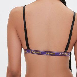 A knit sports bra featuring "Lakers" text on the elasticized waist, V-neckline, adjustable cami straps, and back swan-hook closure.