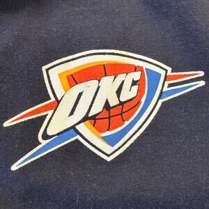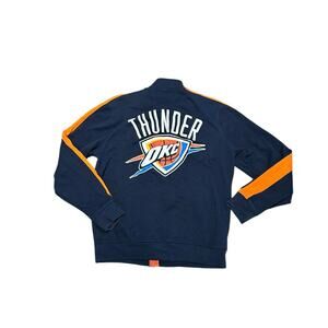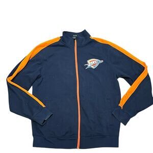 Show your team pride with this awesome NBA OKC Thunder track jacket! This navy and orange jacket features the iconic team logo, making it perfect for game days or casual wear. It is in adult size large. Don't miss out on the chance to own a piece of Thunder memorabilia!