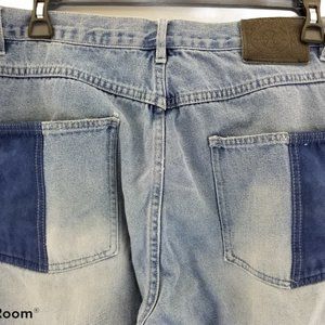 Relaxed fit jeans with NBA team patches. Features Lakers, Nets, Celtics, and Spurs logos. Light blue denim. Comfortable and stylish.