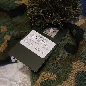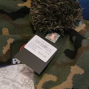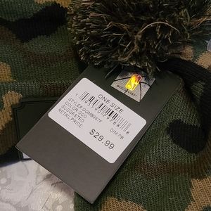 camouflage winter hats with the American flag logo and NBA logo. Fuzz ball on top. Hat can fold to adjust and have a comfortable fit.
