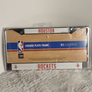 This New silver and white with red lettering NBA Houston Rockets license plate frame measures approximately: 6-1/4" x 12-1/4". All offers are welcome.