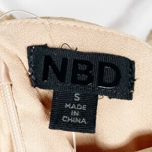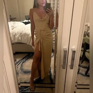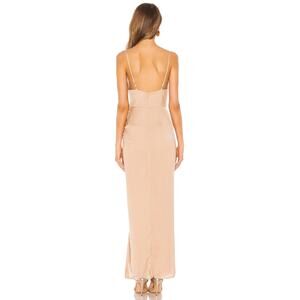 NBD Davis Gown Nude Beige Maxi Dress Ruched Side Slit Stripe Drape Sz S