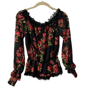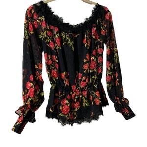 sheer chiffon with tonal polka dot embroidery forms this dainty off-the-shoulder blouse that's trimmed with delicate lace. Cinched at the waist and overflowing with charm, it's the piece to turn to for passionate encounters.. Self & Lining: 100% poly. Hand wash cold. Eyelash lace trim. Elasticized waist. Smocked arm openings. Embroidered polka dot detail throughout