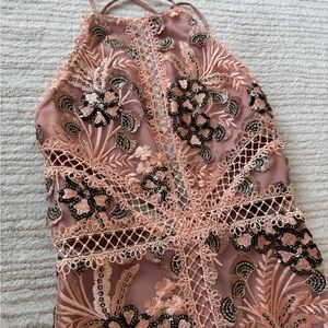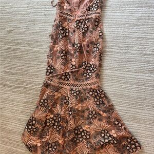 Chic floral lace maxi dress. Features intricate pink and black design. Perfect for special occasions.