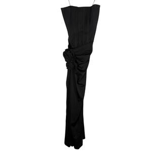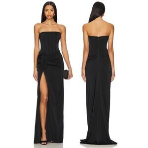 The NBD Jake Gown in black combines romantic detail with a dramatic silhouette. Designed with a strapless corset bodice, this maxi dress is adorned with bold floral rose appliqué for a striking finish. Perfect for galas, weddings, or black-tie evenings where you want to stand out.