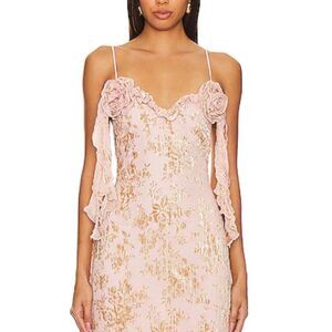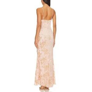 Elegant maxi dress by NBD. Features pink fabric with gold floral design. Spaghetti straps with floral accents. Perfect for special occasions.