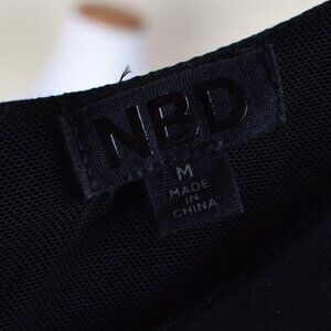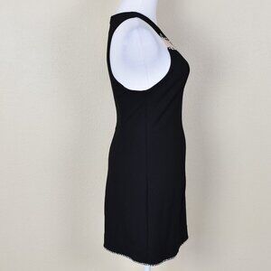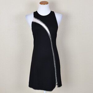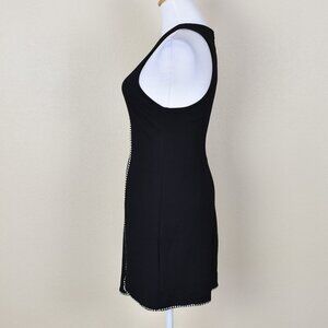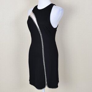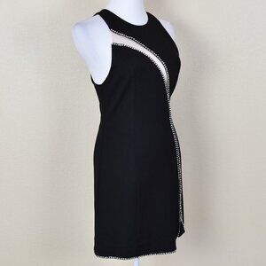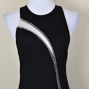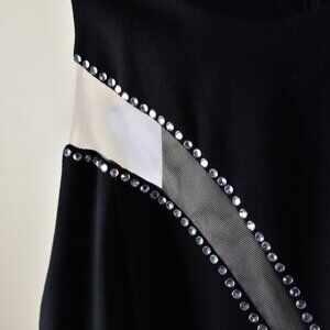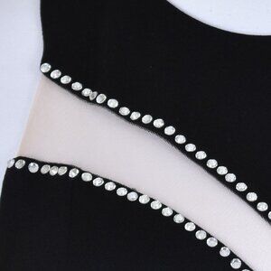 Black ponte knit material. Cream sheer stripe across front of body. Silver colored rhinestone trim.