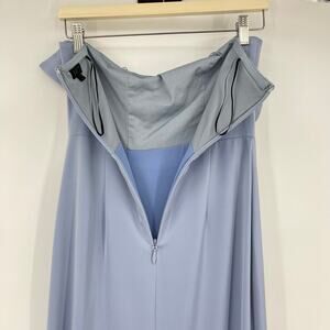 Elegant strapless maxi dress. Features cascading ruffles. High slit for added flair. Perfect for special occasions.