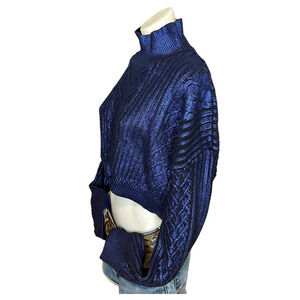 NBD Metallic Blue Cropped Turtleneck Sweater LARGE Cable Knit Designer $208 NEW