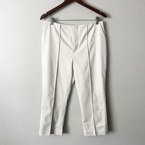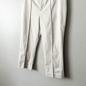 Bone colored skimmer capri pants with small side slits and zip hook/bar front closure.