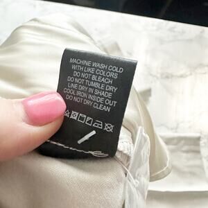Bone colored skimmer capri pants with small side slits and zip hook/bar front closure.