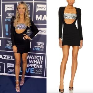 Unveiling the 'Vani Mini Dress' in Black by NBD. Featuring a sultry scoop neck, an embellished bralette front, and padded shoulders crafted from Ponte fabric.