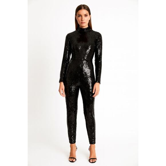 Keywords: sequin jumpsuit, black jumpsuit, holiday outfit, party look, statement one-piece, night out style, cocktail eventwear, modern eveningwear, trending jumpsuits, chic sequin style.
