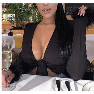 NBD tie front faux feather trim Top Womens long sleeves BLACK. 0050