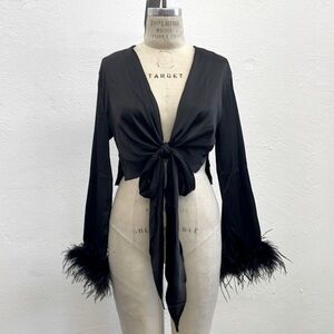 NBD tie front blouse top SMALL BLACK feather trim long sleeve