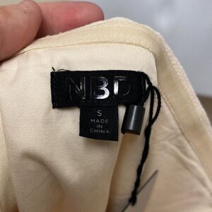 Cream strapless mini dress from NBD. Ruched side at hip with jeweled brooch detail. Size small.
