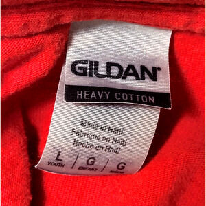 Show your support for the NC State Wolfpack with this officially licensed Gildan football tee. Made from heavy cotton, this unisex youth shirt features a bold red color and the team's logo. Perfect for young fans, it's available in size large and was manufactured in Haiti. Wear it to the game or out and about, and let everyone know who you're rooting for. Connect the dots and add this shirt to your collection today.