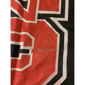 Flag signed by team. Size 16.5 x 24. Colors Black, red and white.