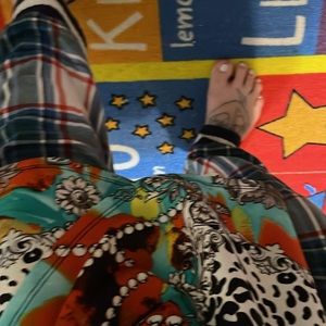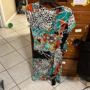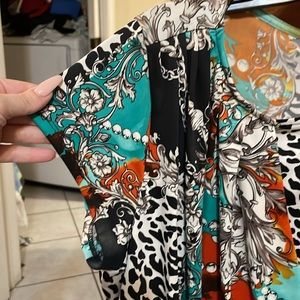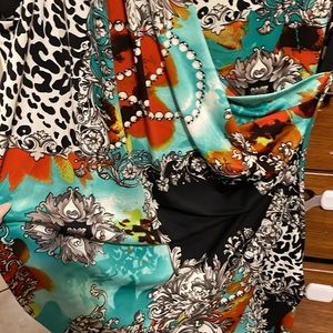 This is a very vibrant, amazing design on this dress and now that I’m looking at it a little bit better somebody who’s pregnant could totally rock this dress. It is a heavy material that is very stretchy. It’s heavy but it’s not too heavy. It’s just very very well-made. It has a slit on the left side, and, it goes up around your collarbone. It is short sleeved and it hits right below the knee and forms kind of like a pencil skirt so it’s like a pencil skirt dressed with as cinched waste, which you know cinched was make you look smaller🙏🏼😍😍😍😍
