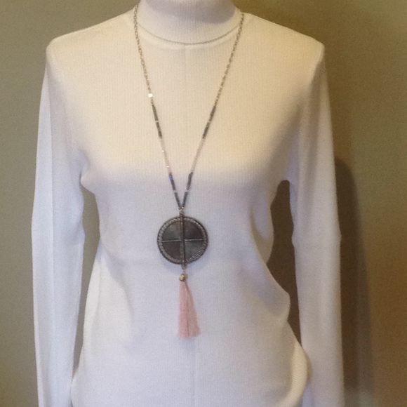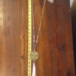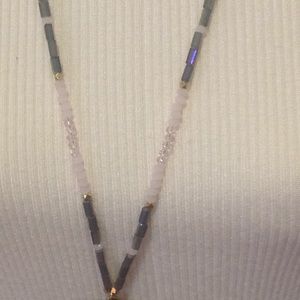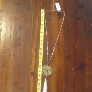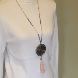 Lovely, adjustable necklace. Antique brass tone desk, pink tassel, Beads are predominately pink and gray with gold Mixtown. Chain is gold tone. New with tags.