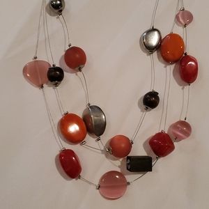 Orange, pink, smoke and silver versatile 3 strand necklace on thin stainless wire.