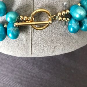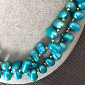TURQUOISE Colored PEARL NECKLACE with gold colored clasp and Beads. Double Strand