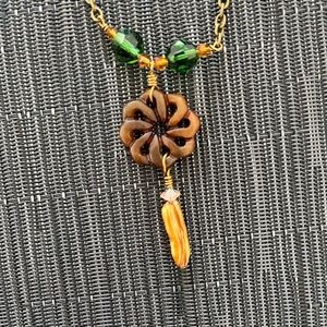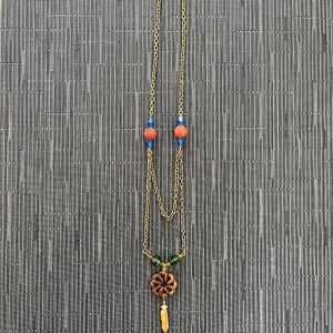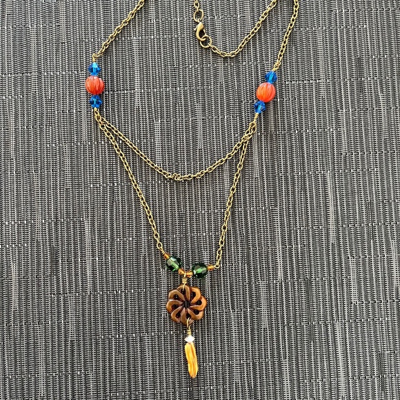 Necklace with Swarovski crystal beads, cornelian flower bead, red agate round fluted beads, gold colored pearl on an antique golden chain. Measures 28 inches.