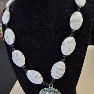 NECKLACE made with white oval-shaped resin beads with black and white acrylic beads with silver-plated large round pendant with image of a rose.