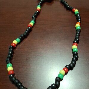 NECKLACE made with multicolored (red, yellow, green) acrylic beads, adorned with black acrylic beads, black lava rocks, tiny silver rounds and silver latch to fasten.