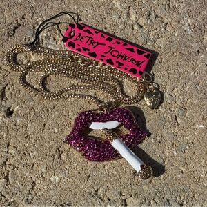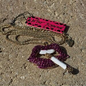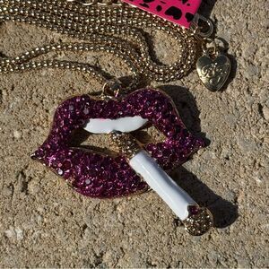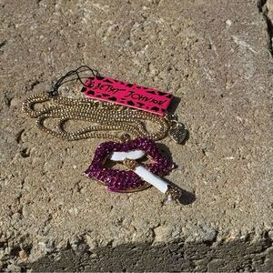 Sparkling Betsey Johnson purple lips necklace pendant with a gold colored chain. Features a unique design with a cigarette detail.