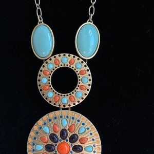 NECKLACE & EARRING SET Gold Toned Orange & Blue Stones 20"