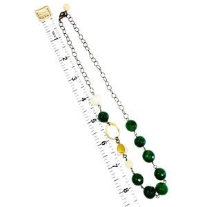 This is a darling hand crafted necklace with a cream rose bead & green beads. I bought it at a local boutique and unfortunately don't have the material information.