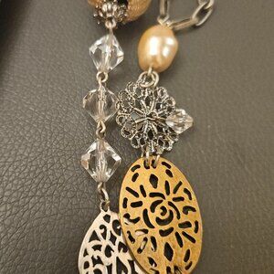 This necklace is so interesting and will bring drama to the right outfit. Wear it long or short, casual or dressy. Zoom in to see the interesting beads. It is 42 " long without the back chain which could add another 6.5". It's colors are white, silver, and gold. Bundle to save 10% and save on shipping too!