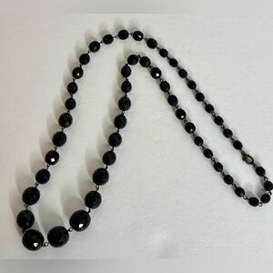 First necklace has a 30” black chain with black faceted beads. 15” drop. Larger beads that graduate to smaller ones. Clasp in the back. The other necklace has double strands, 21” long, 10 1/2” drop, black beads are shimmery with silver round brushed beads and has several discs in between beads. Silver tone chain. Excellent condition
