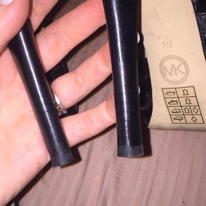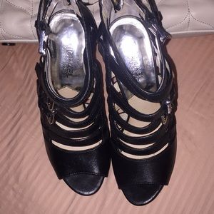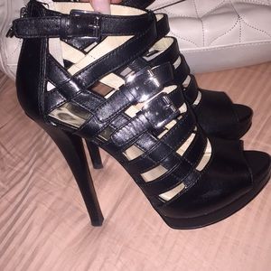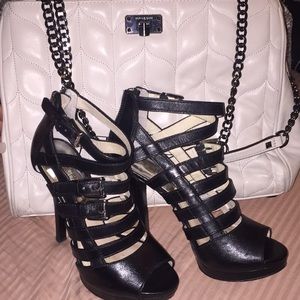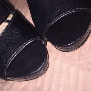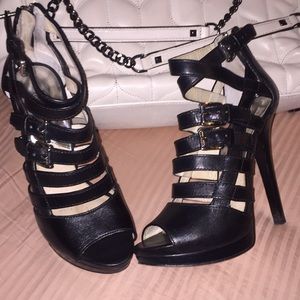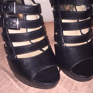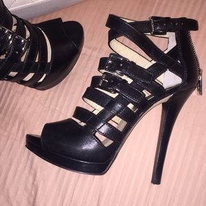 Black leather, silver buckles and back zippers. Worn during one weekend on holiday, sleek and sexy, felt like a Bond girl😉 5 1/2” heel, 1” platform. I honestly can’t remember how much they were new. I know over a hundred.