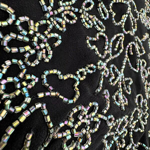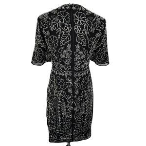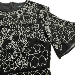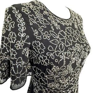 Keywords: beaded dress, cocktail dress, party dress, evening dress, floral dress, embellished dress, black dress, silver beads, special occasion dress, formal dress, women's dress, short sleeve dress, knee length dress, vintage style dress