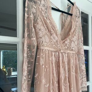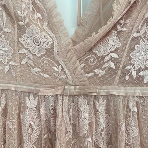 For a beautifully designed vintage-inspired gown look to Needle & Thread's dotted tulle option. Featuring a grosgrain ribbon waistband intricate lace and a fitted bodice this ruffle-shouldered dress will give you an effortlessly elegant evening option that can carry you through multiple seasons. Size 4 new with tag.